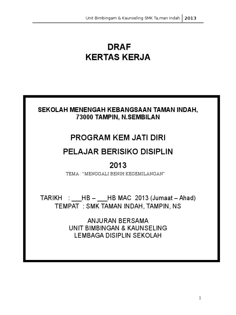 Kertas kerja kem pemantapan sahsiah murid. Artikel ini membahas lengkap kertas kerja audit dari pengarsipan kepemilikan & kerahasiaan susunan metode indeks jenis syarat isi tujuan pengertian. Telah berlangsung satu program kem jati diri fasa 1 mrsm kuching bagi tahun 2020. Kertas kerja kem jati diri ( pelajar berisiko ) 2013.doc. 5 hingga 7 mac 2020 tempat: Kertas kerja kem pemantapan sahsiah murid. Kem jati diri guru smkttdi smk taman tun dr ismail. Kertas kerja kem jati diri (pelajar berisiko). 7/23/2019 contoh kertas kerja kem celik jawi. Selain itu, diharapkan peserta yang mengikuti pelatihan tersebut dapat termotivasi dan membuka usaha sendiri. Dengan work smart kamu bisa menghibur diri setelah kerja yang melelahkan. Visit our blog in wirajayaexcellence123.blogspot.com. Kertas cadangan program kecemerlangan pmr dan spm.