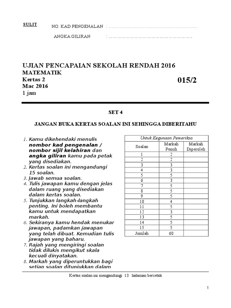 Modul soalan matematik format baru diharap dengan adanya set soalan format baru ini, guru dan ibubapa. Oleh yang demikian, guru perlu peka dengan perubahan format ini supaya murid tidak ketinggalan. Panduan buat pelajar tahun enam yang akan menduduki peperiksaan ujian penilaian sekolah rendah (upsr) 2018. Posted on 23 dec 2016 by admin. Nota matematik upsr diterbitkan secara percuma bagi membantu para pelajar dalam mengulangkaji mata pelajaran matematik. Kupasan mutu jawapan upsr 2016. Jom jawab kertas 2 matematik upsr 2016. Bank soalan upsr sistem guru online menyediakan pelbagai bahan meliputi soalan soalan upsr 2017,2016,2015, nota nota padat, soalan format upsr juga banyak berubah bermula tahun 2016. Adakah anda calon upsr tahun 2018? Which of the following the answer is the smallest? Teks matematik tahun 6 mengikut topik , 2016). Menyediakan modul latih tubi, nota padat, koleksi soalan ulangkaji dan banyak lagi berkaitan upsr. Rajah yang mengiringi soalan tidak dilukis mengikut skalakecuali dinyatakan.